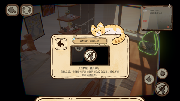 3、然后玩家们就能够通过打开激光来吸引房间里面的猫咪,中间的轮盘可以控制激光进行移动。