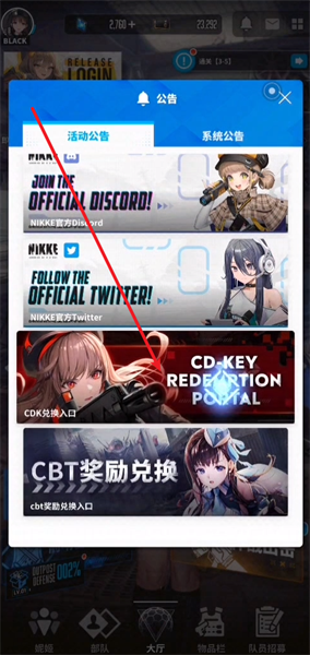2、打开公告的界面,并往下滑找到CDK兑换入口之后点击。
