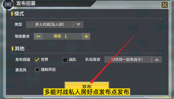 4、就会弹出一个发布招募的模式选择界面,这个时候只要在模式类型里面选择【多人对战(私人房)】就行。