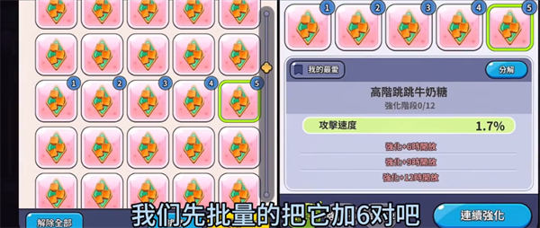 3、根据自己的需要,将刷取的配料批量选中,并将其升到六级。