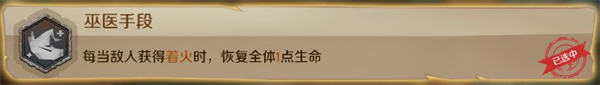 专属卡牌“焚荒”能提供一个稳定的全体着火buff,配合初始天赋“巫医手段”可以在前期拥有较强的恢复能力。