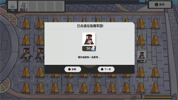 5、玩法的操作轻松简单,击退垃圾桶军团之后将能够获取到对应的奖励,你可以点击【下一关】来游玩后续的关卡。
