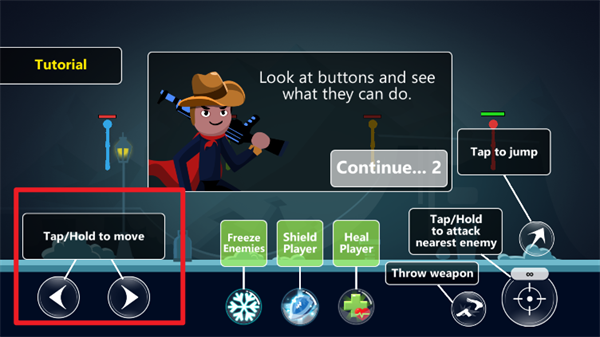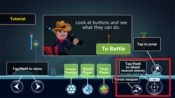 3、玩家们点击右下角的按键可以控制角色进行攻击、跳跃以及换枪。