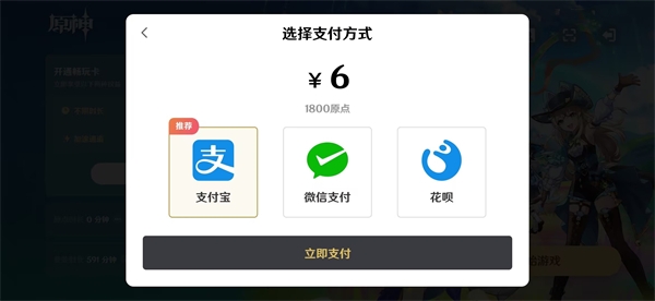 3、选择自己想要充值的挡位之后,点击立即支付,就能够跳转到支付的界面,你可以选择自己想要的方式来进行支付。