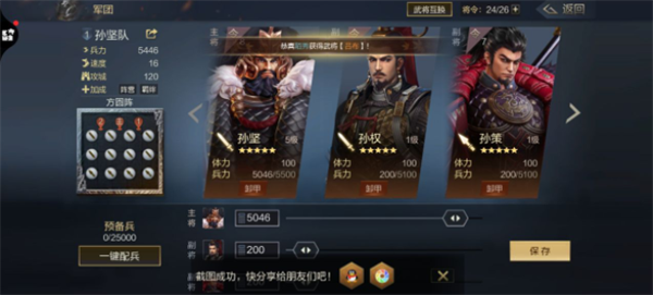 例如由孙坚+孙权+孙策组成的江东三虎。因为孙坚的武将技能可以提升自身防御,配上方圆阵减少全军受到的主动武技效果,能够在兵力优势的情况下形成合围的局面。依靠武将技的输出慢慢扩大优势,方圆阵显然很适合此类阵容。
