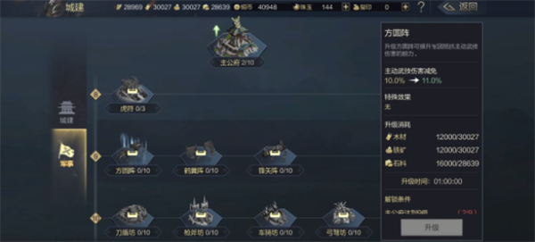 在城建玩法中,我们可以通过升级建筑提升阵型的BUFF效果。推荐大家在拥有额外资源后再去升级阵型,一般在游戏中需要更多武将进行搭配,阵型的效果才能得到很好的发挥。