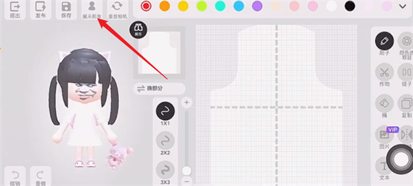 4、选择其中一个模板,比如连衣裙,就会加载衣服的加工界面,在这里能够对衣服进行自由的加工,点击左上方的展示形象,你将能够直观的看到衣服上身的样子。