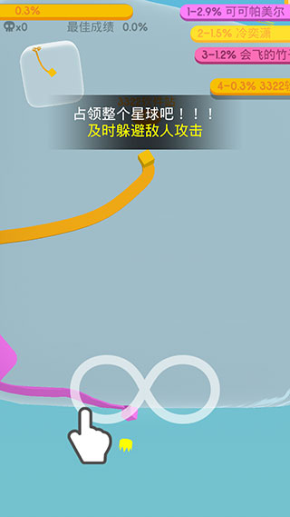 5、开始征服掌握这些技巧后,你就可以开始尝试占领整个星球了。在扩张领地的同时,记得要时刻留意躲避敌人的攻击。游戏界面右上角会显示你当前的占地面积百分比和你的排名,而左上角则是星球的地图模型,帮助你更好地规划战略。