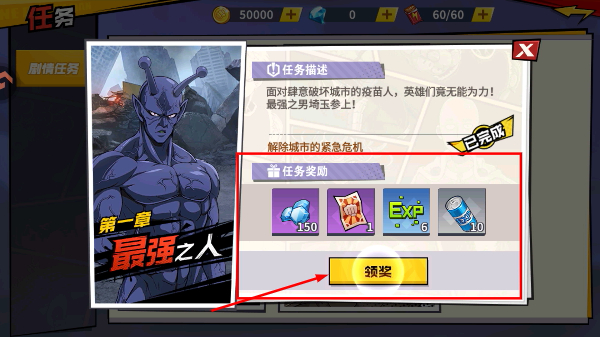 3、完成指定剧情任务后,领取包含【经验-道具-Exp-体力道具】的奖励,强化角色战力。