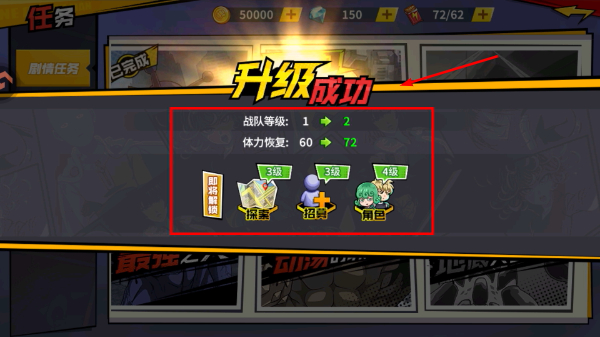 4、达成升级条件触发【升级成功】,战队等级提升,体力恢复增加,解锁【招募-角色】功能。
