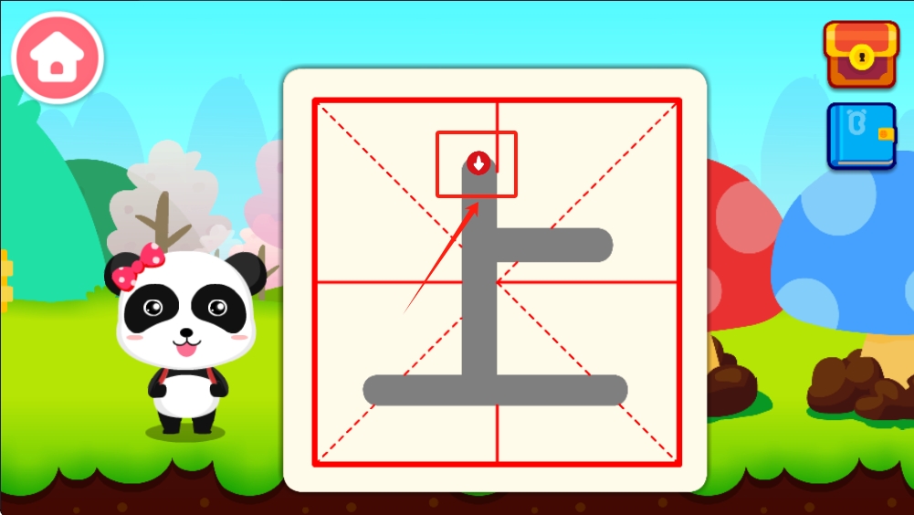 2、点触屏幕中央带有米色背景的田字格区域,观察熊猫示范“上”字书写笔顺。