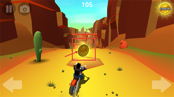 2、骑行过程中,操控方向键让摩托靠近道路中的金币,收集金币可提升分数,当前界面分数显示为【105】。