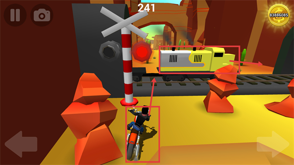 3、遇到铁轨与火车时,需及时调整摩托方向避开,避免碰撞影响骑行进程,同时留意周围障碍地形。