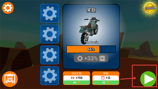 4、在奖励界面,可查看【The-Barcia】摩托的解锁进度为【66%】,点击绿色按钮可继续推进游戏获取奖励。