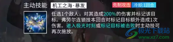 1、机工之海暴发:任选一个敌人,对其造成200%的伤害并标记,弗劳尔连锁技本回合对标记目标额外造成1次伤害。