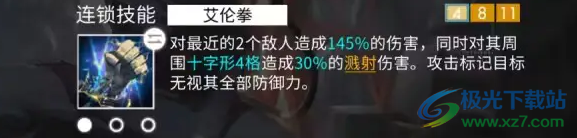 2、艾伦拳:行经4/8/11格后,对最近的2个敌人造成伤害,并对其周围十字形四格造成溅射伤害。