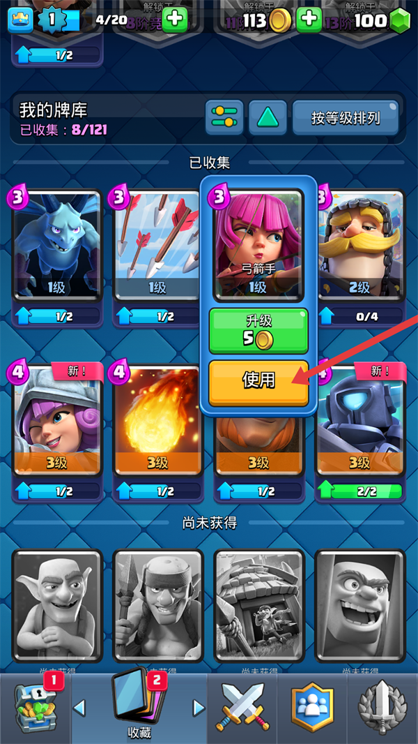 1、在牌库中优先点击【弓箭手】的【使用】按钮,让该职业出战更有优势哦。