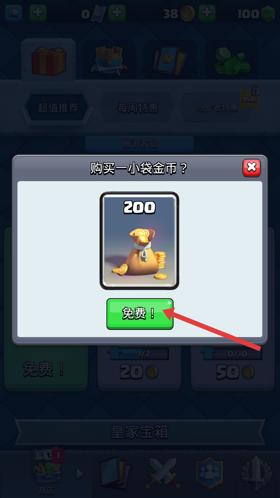 2、看到【购买一小袋金币-免费】的提示别错过,领取免费金币用来升级卡牌。
