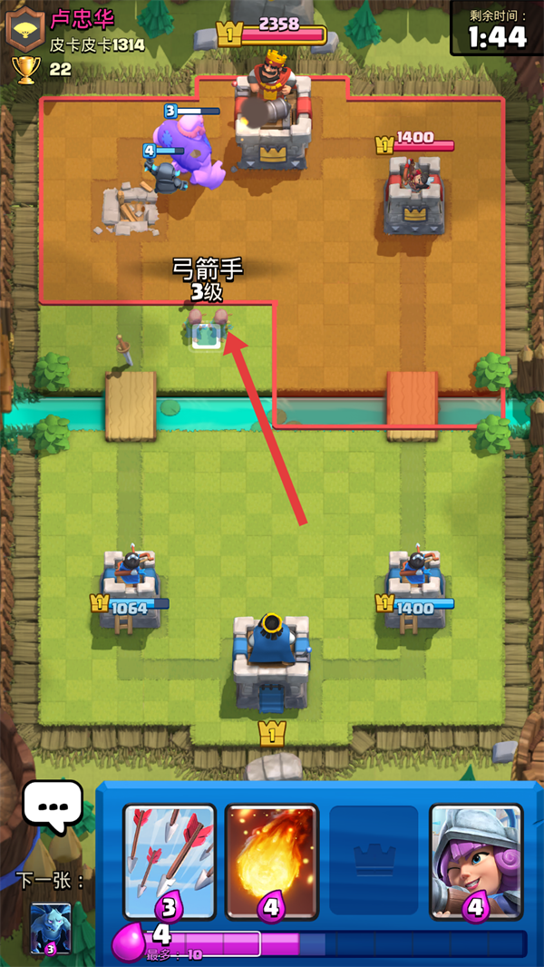 3、对战时在己方半场部署【弓箭手-3级】,利用其远程优势消耗敌方建筑和单位,远程输出能有效牵制敌人。