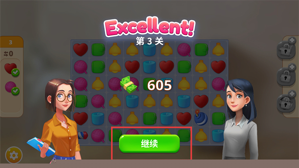 4、关卡完成后点击【继续】按钮,领取当前关卡奖励,然后进入下一关继续游戏。