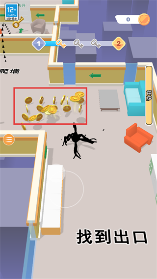 2、移动过程中收集场景里的【金币】,积累资源的同时继续朝着出口方向前进。