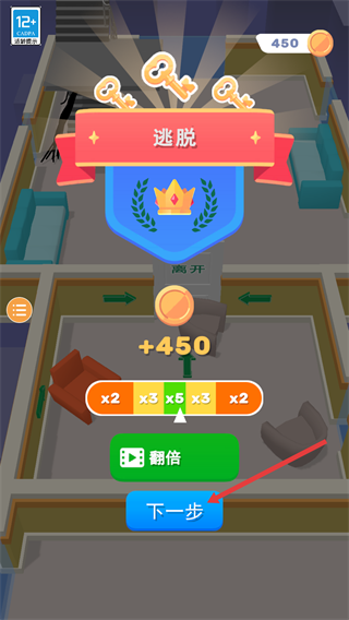 4、逃脱成功后获得【450】金币奖励,点击【下一步】可进入新的关卡继续挑战。