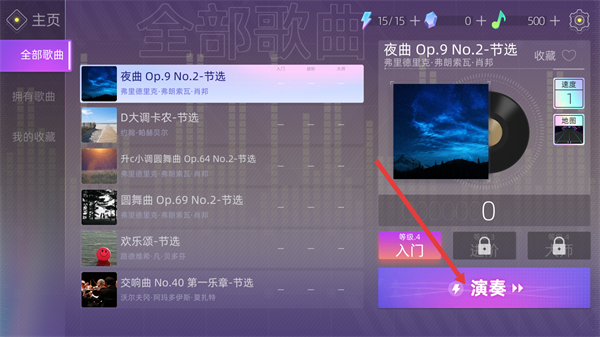 1、在【全部歌曲】列表中选定曲目(如【夜曲-Op.9-No.2-节选】),点击【演奏】按钮进入游戏关卡。